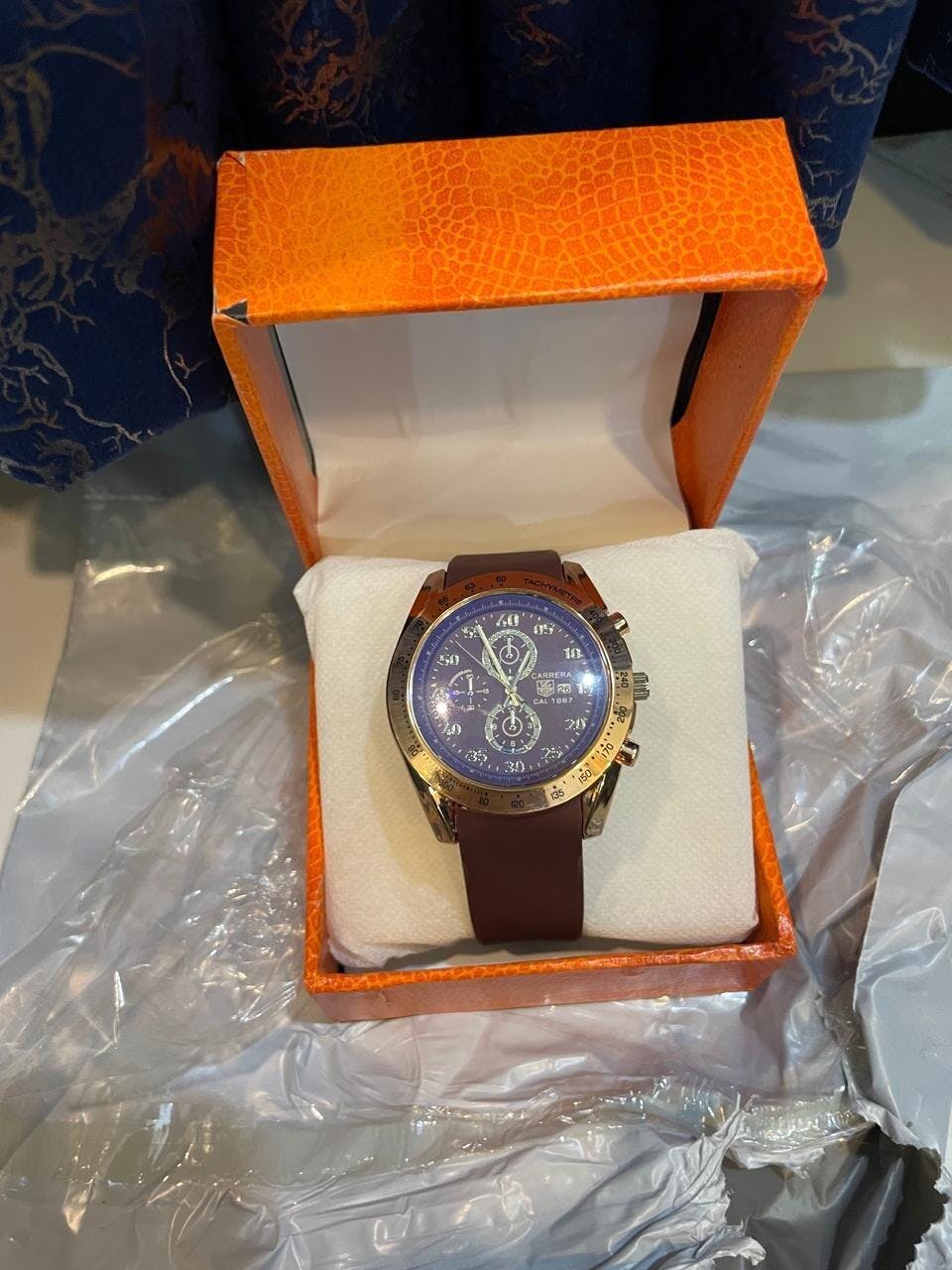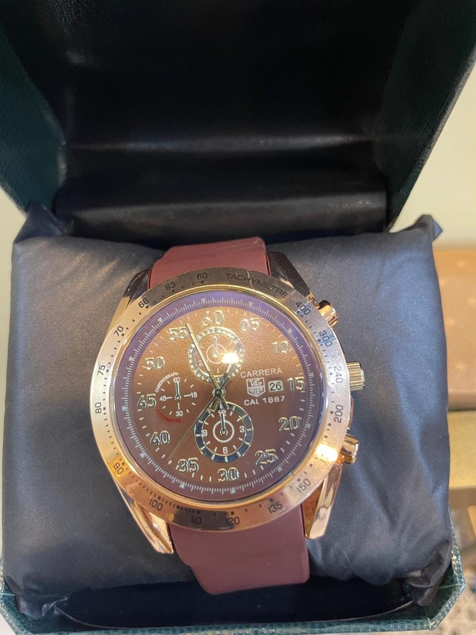 Dial: Gradient brown dial with luminous hands, bold numerals, and three multifunction sub-dials