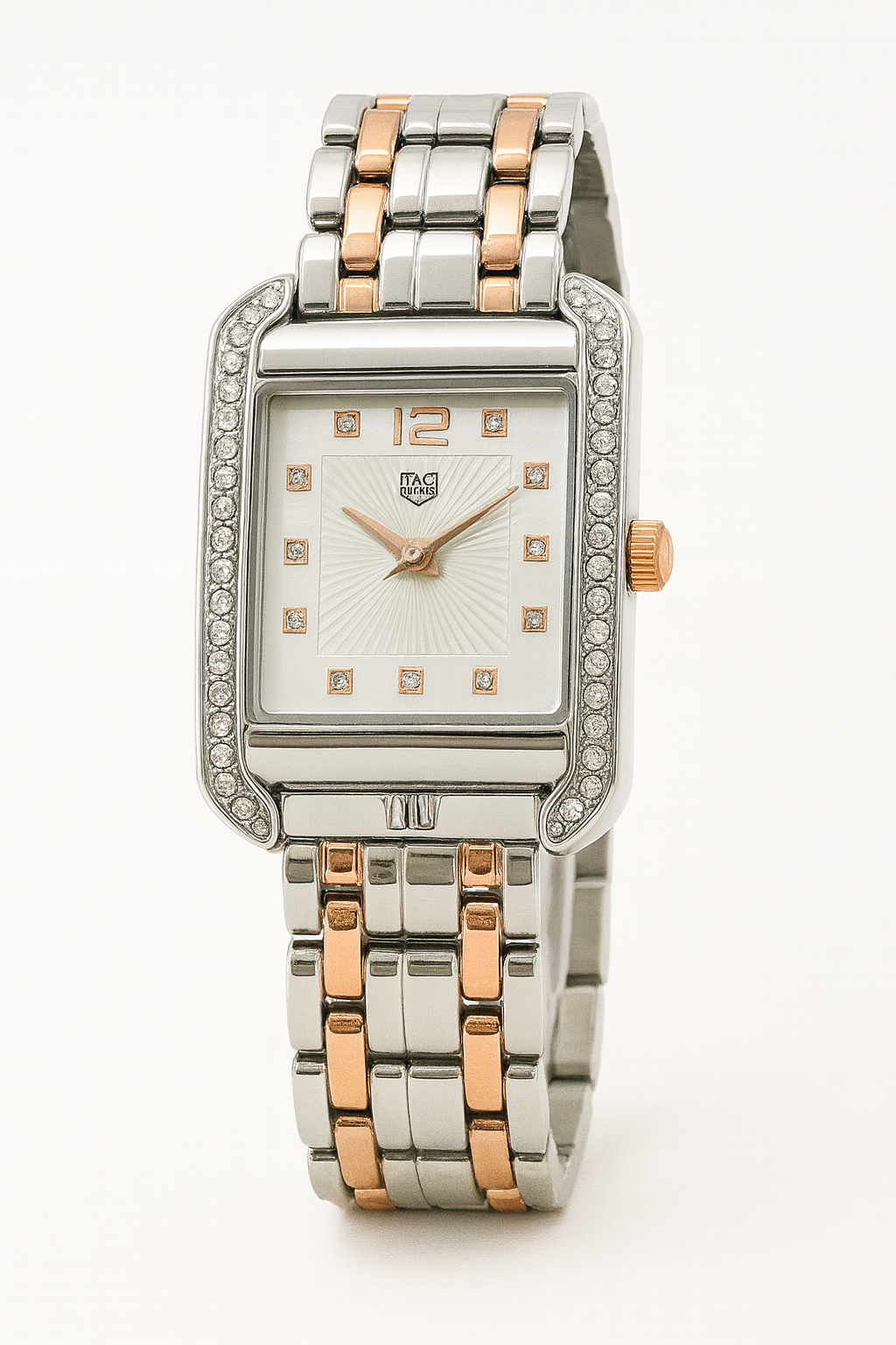 The rectangular silver dial framed with sparkling crystal stones brings a touch of glamour, while the two-tone silver and rose gold bracelet adds a warm, feminine finish. The minimalist layout with diamond-style hour markers and rose gold hands ensures a classy, refined look for every occasion.